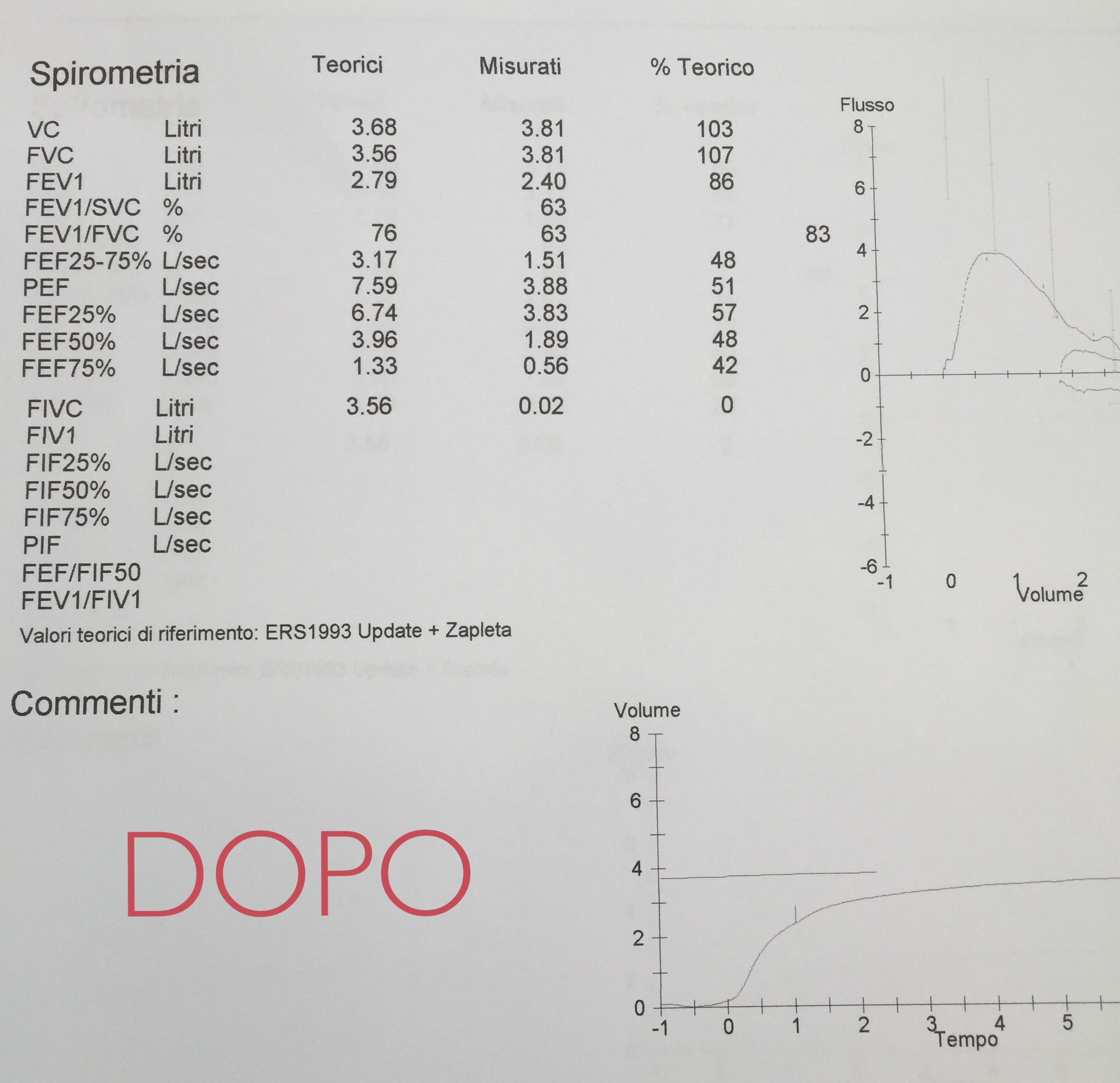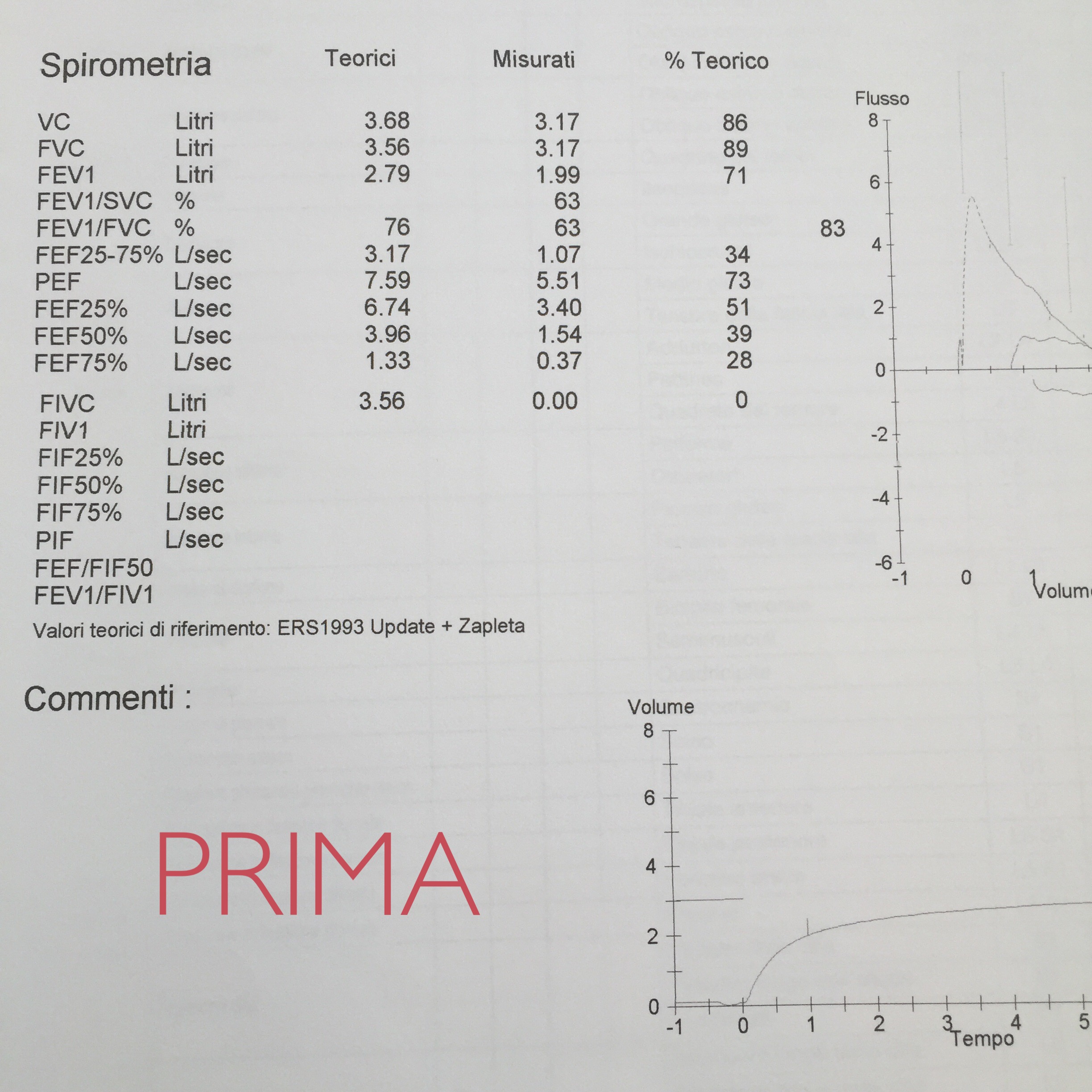 Osserviamo il miglioramento del Volume Corrente VC (quantità di aria che viene mobilizzata in un atto respiratorio) che da 3.17 litri passa a 3.81, quindi dall’86% al 103%. Anche la FVC (ovvero il volume di aria spostato in espirazione forzata dopo inspirazione massimale) migliora dall’89% al 107%, così come la FEV1 (volume espiratorio forzato all’intervallo di 1 secondo) migliora dal 71% all’86% dei valori teorici.